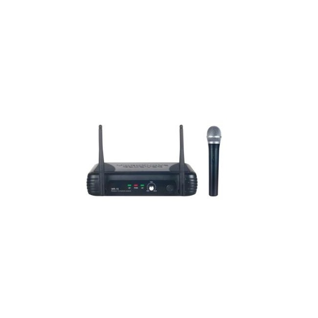 Radiomicrofono UHF comprensivo di una base ricevente e 1 microfone trasmittente "a gelato". Dispone di comando per volume. Alcuni led segnalano la presenza di segnale di portante e il segnale RF. I connettori posteriori, sono di tipo XLR e Jack 6,3mm.
