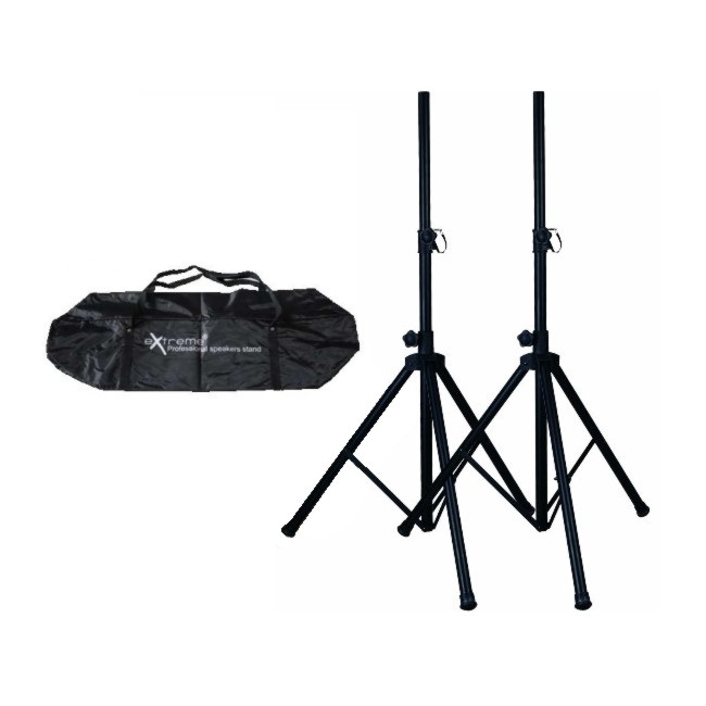 - Set completo con coppia di supporti in alluminio per casse acustiche, dotati di sistema di sicurezza in acciaio a mezzo pin e pratica borsa Extreme per un comodo trasporto.