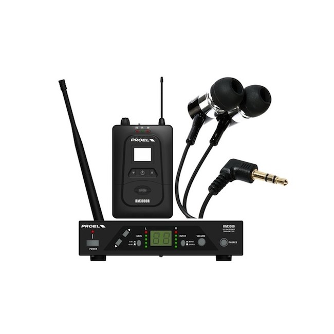 Composto da un trasmettitore RM3000 alloggiato in 1/2 unità rack con telaio in metallo, dispone di 16 frequenze selezionabili (sintesi PLL), indicatori di livello audio (L&R) selettore di canale e display.