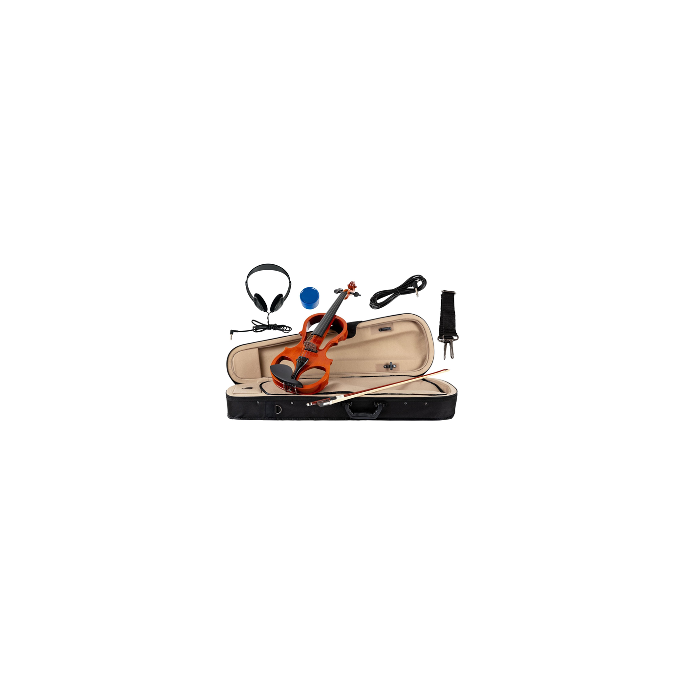 Completo di astuccio ultraleggero sagomato e imbottito, colofonia, mentoniera, cuffie, cavo