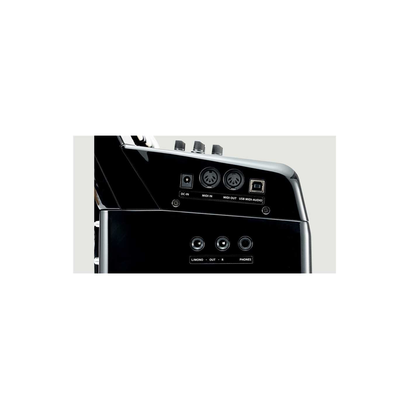 FISA SUPREMA BUTTON MBK is equipped with MIDI In/Out, Bluetooth MIDI and Audio, USB MIDI, USB Audio, and Audio Out L/R, allowing integration with digital setups, recording, and live performance systems.