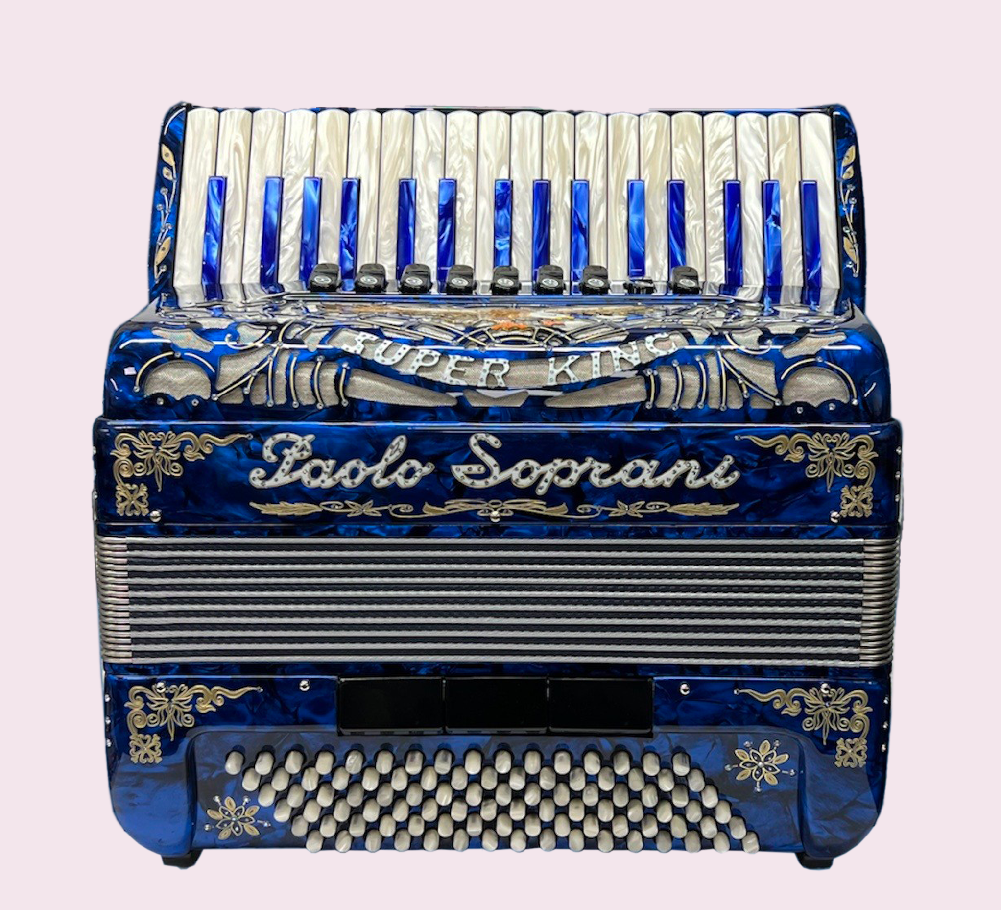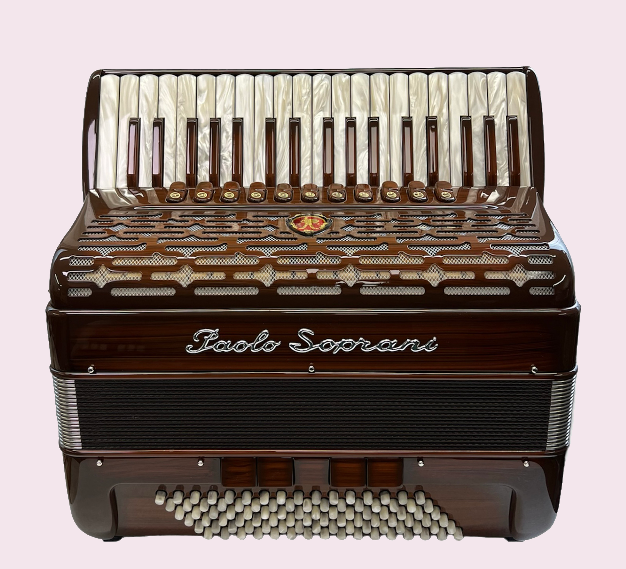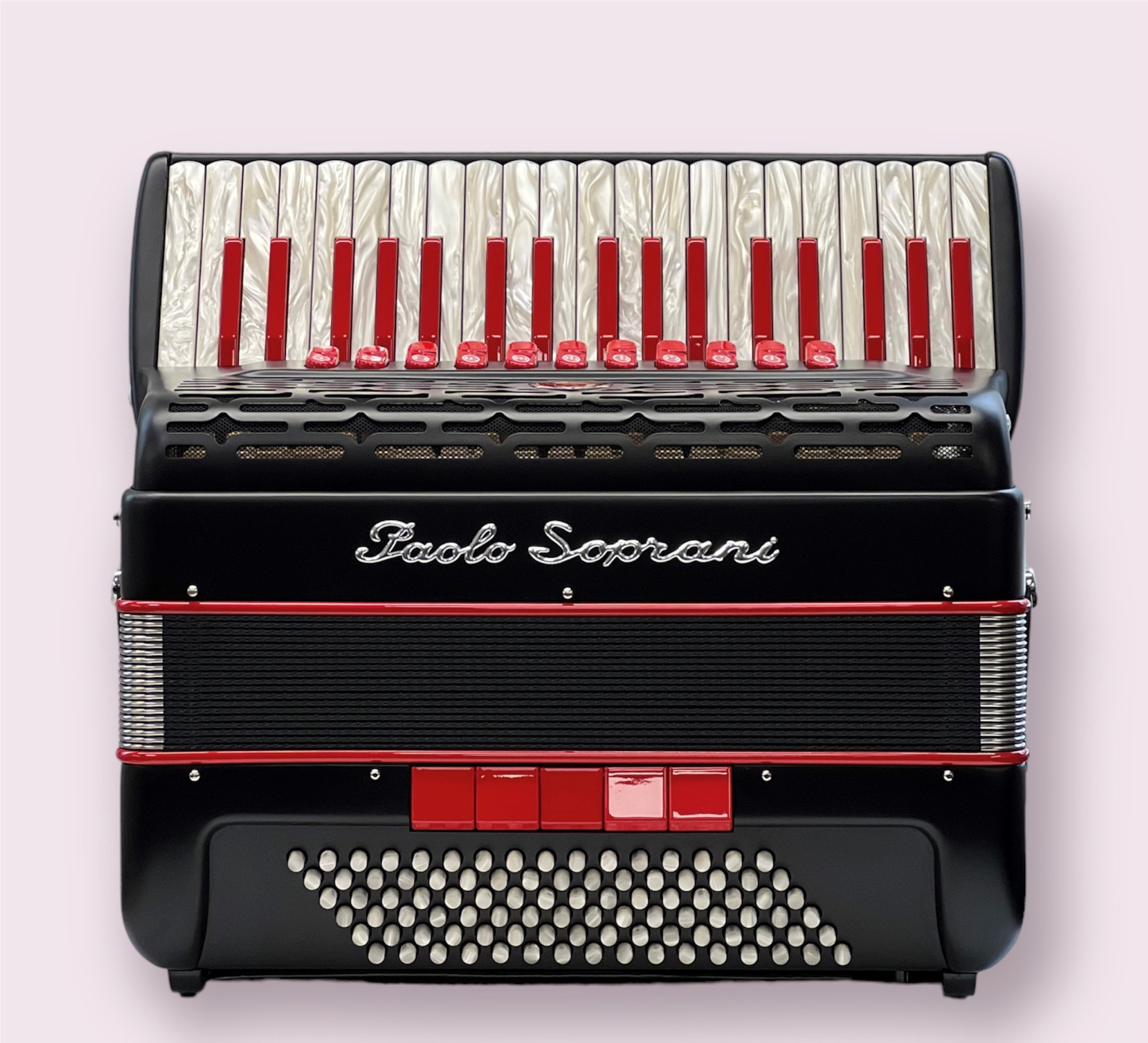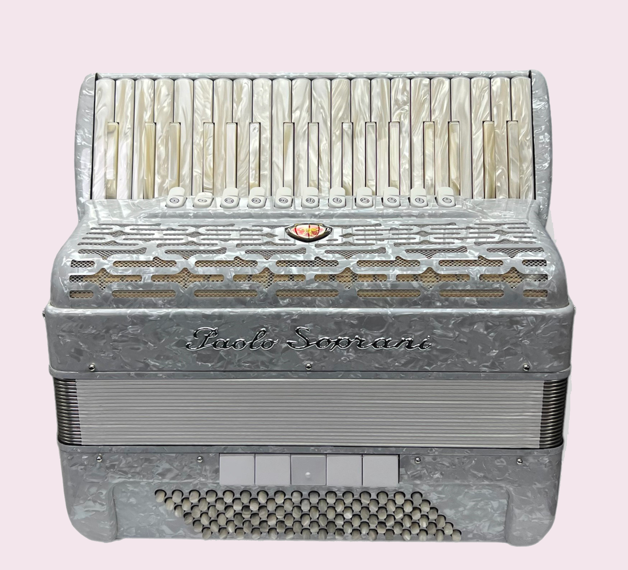 Si tratta del più pregiato modello mai prodotto dalla Paolo Soprani, con Doppio cassotto, mantice stampato intercambiabile con finiture oro, scocca in madreperla e logo dal design elegante e minimal. Un pezzo da collezione che nasce dall’esigenza di omaggiare il grande Imprenditore Paolo Soprani proponendo il suo busto tra il mantice: un’idea nuova, frutto di un attento studio di Massimo Mazzantini - titolare di Castelfidardo Musica - che, assieme a sua figlia, ex studentessa di Design, ha progettato un metodo per rendere ricostruibile l’immagine da una precisa angolazione.